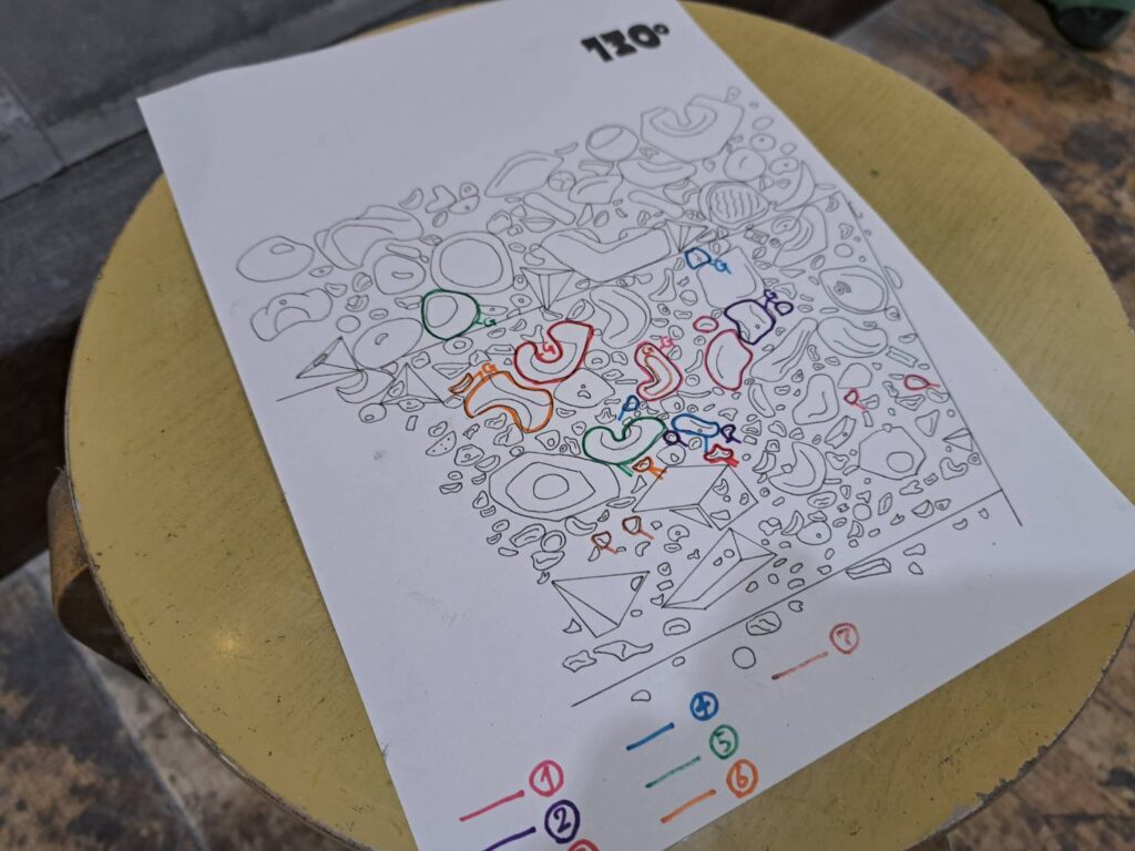 95°〜130°までの傾斜で壁は4面、それぞれに7本、合計28本のランジやコーディネーションの単発課題を作成。